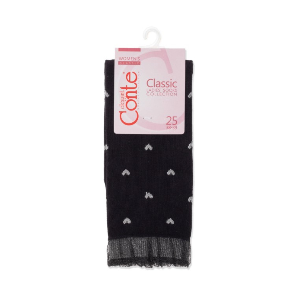 Katoenen damessokken in de kleur zwart met lurex zilver kleurige hartjes en een lurex zilver kleurige boord. De sokken zijn gemaakt van fijn gekamd katoen en daardoor lekker zacht en soepel. Daarnaast zijn de sokken gemaakt van dun ademend katoen met elastaan. OVER DIT PRODUCT WASVOORSCHRIFTEN |