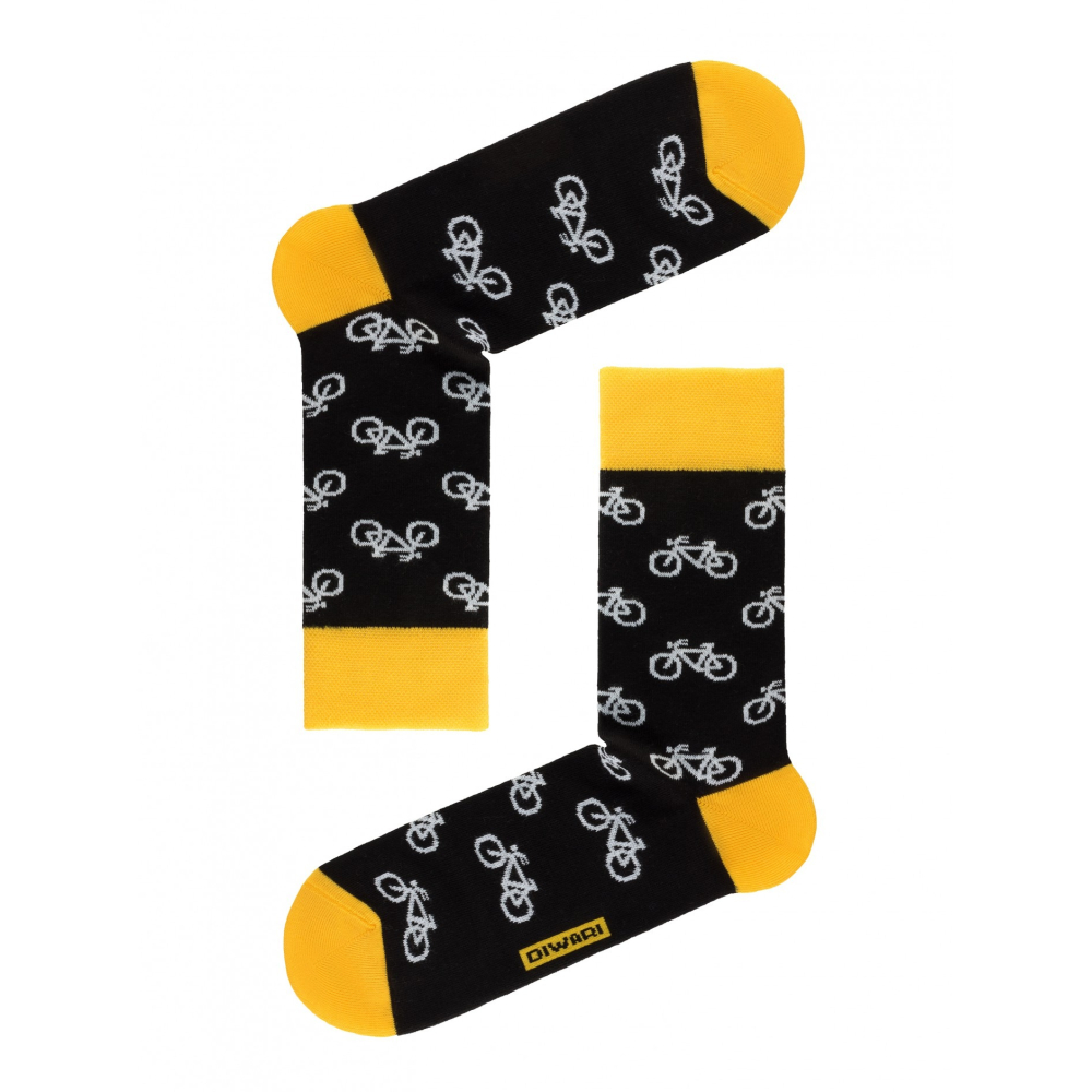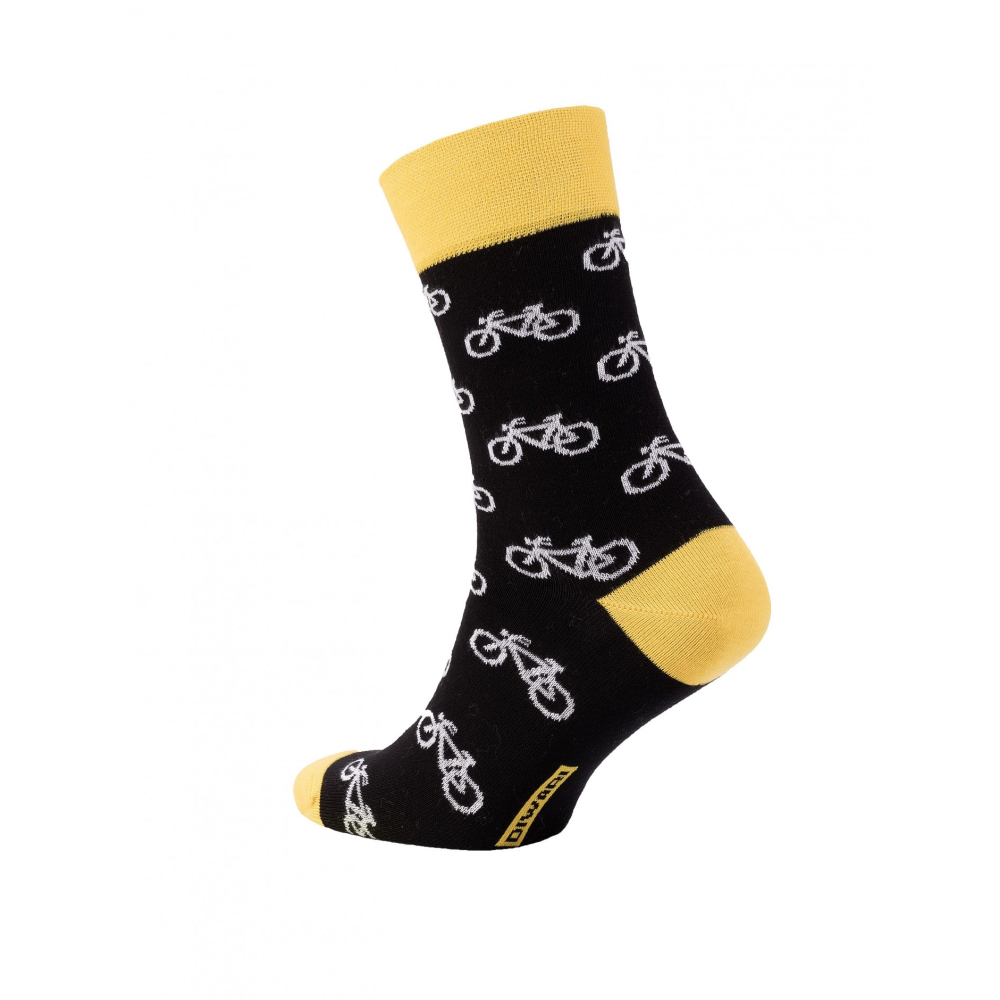 Deze leuke herensokken hebben een vrolijk design van fietsen met contrasterende top en tenen in een felle gele kleur. De sokken zijn verder anatomisch gevormd met een brede boord en door voldoende elasticiteit hebben ze een mooie pasvorm. Daarnaast zijn ze gemaakt van gekamd katoen met platte naden voor langdurig draagcomfort.