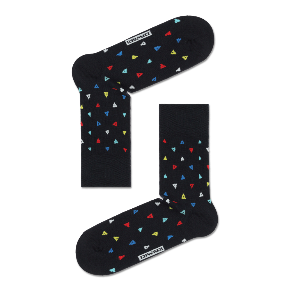 Deze leuke donkerblauwe herensokken hebben een vrolijk design van gekleurde driehoekjes op een donkerblauwe ondergrond. De sokken zijn anatomisch gevormd en door voldoende elasticiteit hebben ze een mooie pasvorm. Daarnaast zijn ze gemaakt van gekamd katoen met platte naden voor langdurig draagcomfort.