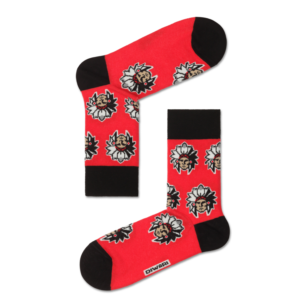 Deze leuke herensokken hebben een vrolijk design van indianen met contrasterende rode kleur. De boord, tenen en hiel zijn zwart. De sokken zijn verder anatomisch gevormd en door voldoende elasticiteit hebben ze een mooie pasvorm. Daarnaast zijn ze gemaakt van gekamd katoen met platte naden voor langdurig draagcomfort.