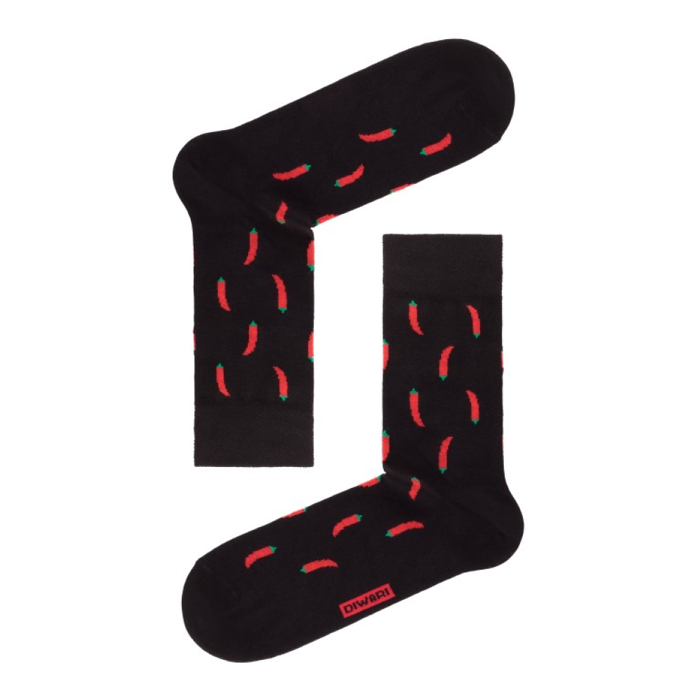 Comfortabele herensokken gemaakt van gekamd katoen, in een vrolijk design van contrasterende chili pepers. De sokken hebben keurig afgewerkte, platte naden een een brede anatomische boord die niet afzakt. Door de hoge kwaliteit katoen in combinatie met elastaan hebben deze sokken een mooie fit en ze zullen hun anatomische vorm behouden, zelfs na meerdere wasbeurten.